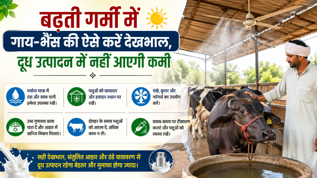 गर्मियों में पशुओं के लिए साफ और ताजा पानी सबसे जरूरी होता है, लेकिन बहुत ज्यादा ठंडा पानी नहीं देना चाहिए। दिन के समय पशुओं को धूप से बचाकर शेड में रखें और सुबह-शाम ही बाहर निकालें। शेड में हवा का अच्छा प्रबंध होना चाहिए, ताकि तापमान नियंत्रित रहे। जरूरत पड़ने पर पंखे, कूलर या पानी का छिड़काव किया जा सकता है। साथ ही, पशुओं को संतुलित आहार, मिनरल मिक्सचर (50-60 ग्राम) और हरा चारा देना चाहिए ताकि उनका स्वास्थ्य और दूध उत्पादन दोनों बेहतर रहें।